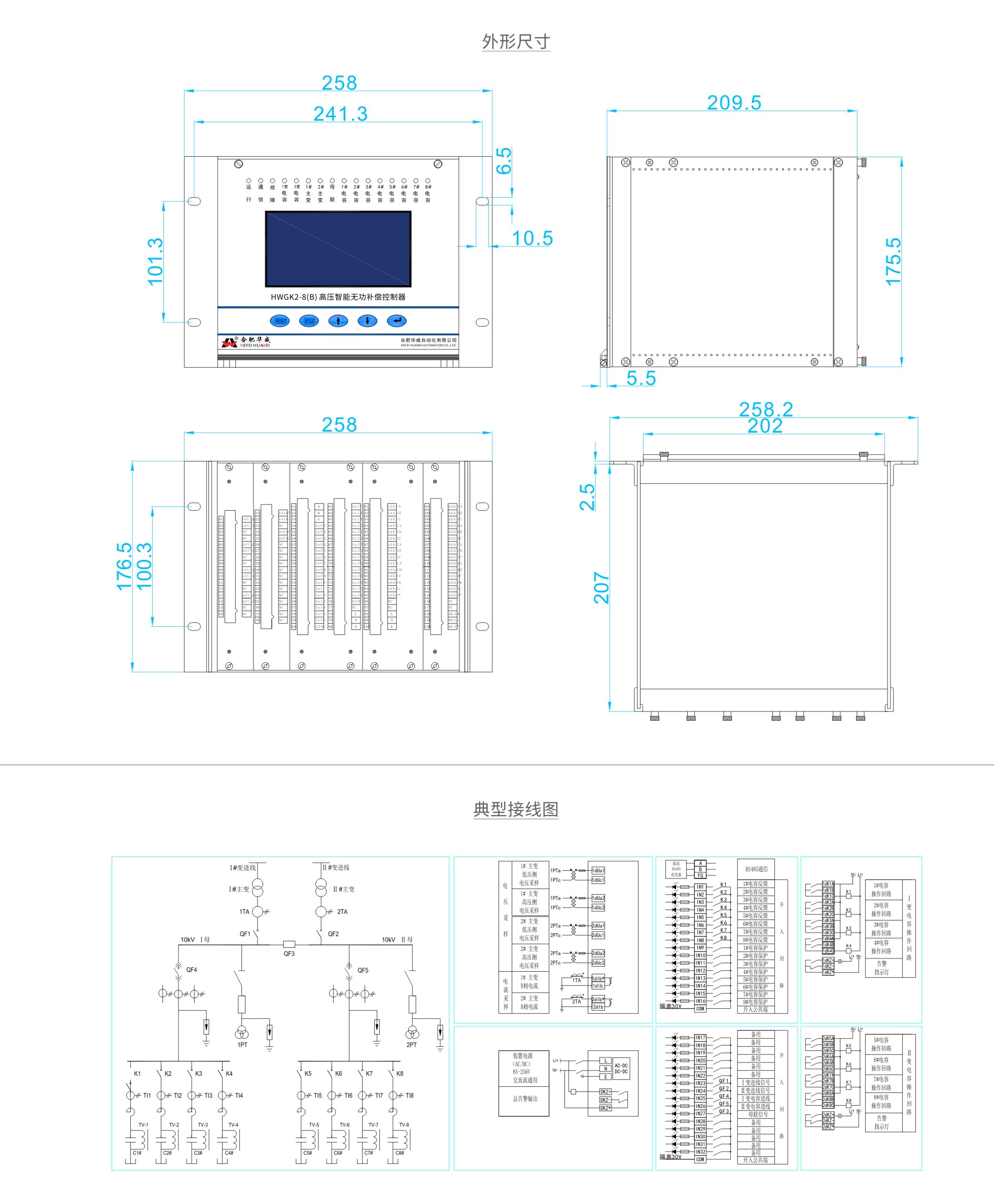 HWGK2-8 (B)高压智能无功补偿控制器集测量、监视、控制、人机接口、通信等多种功能于一体;采用32位数字信号 处理器(DSP),具有先进内核结构、高速运算能力和实时信号处理等优良特性。本控制器具有电容器投切控制、数据 统计和存储功能,自动识别两台主变的运行模式,可控制2段母线共8组电容器组,根据电网的参数控制无功补偿电容器组的自动投切,使电容器工作在较好的状态,有效减少无功损耗并保持系统功率因数在较高范围内。