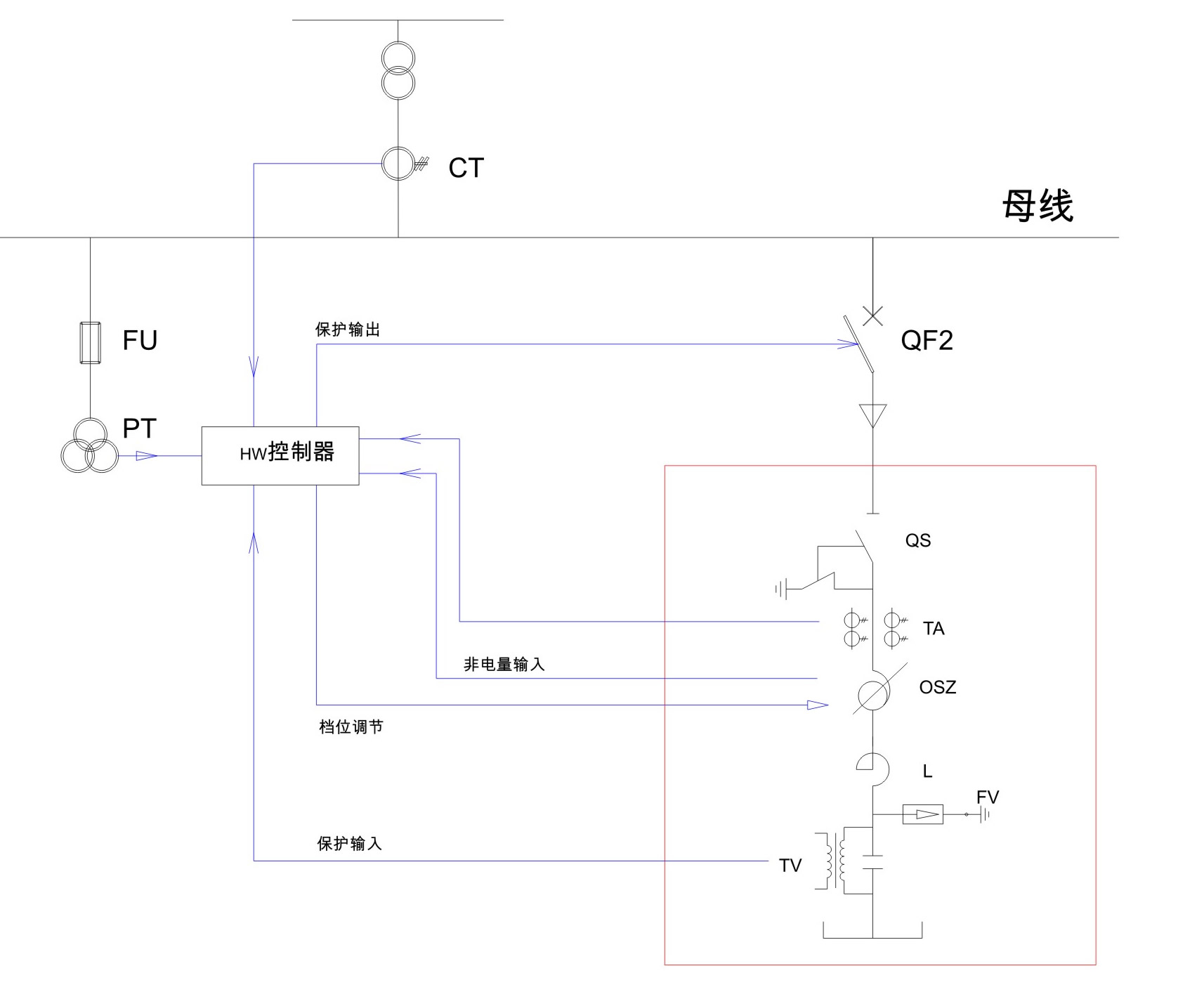 HWVKC电压调节型无功自动补偿装置采用电容器固定接入,通过改变其端电压从而改变电容器组补偿容量。根据Q=wCU²原理,电容器不变,端电压从100%Un降到50% (或40%、60%)Un, 其输出容量就可在100%~25%(或16%、36%)XQn下进行调节,改变电压调节级差就可以改变容量调节级差。装置主要包括高压隔离开关、电压调节器干式或油式、串联电抗器、高压并联电容器、放电线圈、避雷器、补偿控制器、有载分接开关控制器等二次器件及其附属设备。